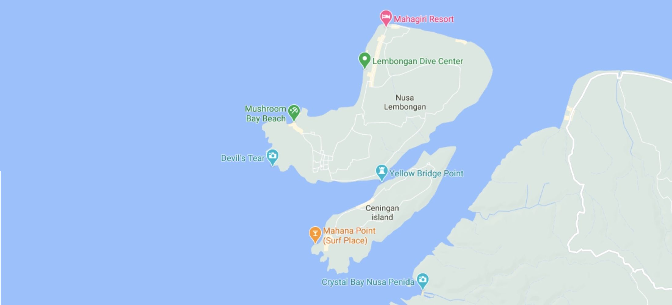 Nusa Ceningan is the small island between the larger islands of Nusa Lembongan and Nusa Penida. It is connected to Nusa Lembongan by the yellow bridge.