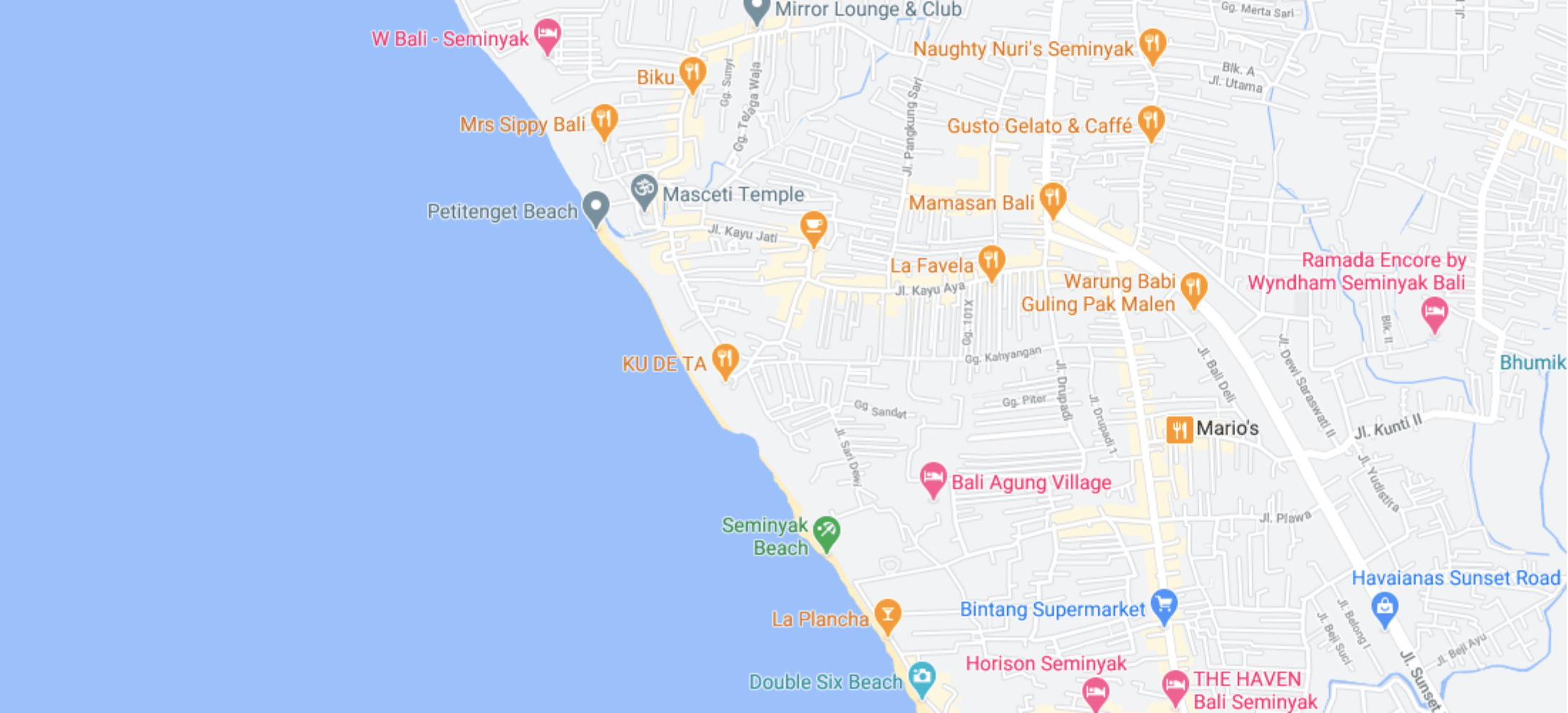 Seminyak is located on the west coast of Bali neighbouring Legian to the north.