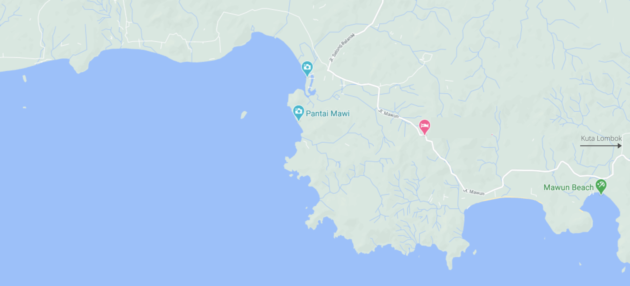 Located in South Lombok in between Selong Belanak and Mawun beaches and approximately 45 minutes west of Kuta Lombok by car or scooter.